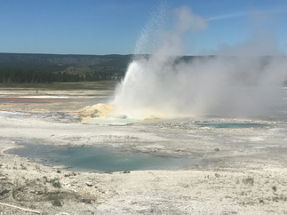 The next morning we entered the park from the west and decided to head south and see the geyser basin area and make our way to Old Faithful. Lots of stops along this road. If you can help it I recommend seeing on a sunny day…the colors are amazing! We lucked out and the sky was blue as could be and all the colors just danced. If you are sensitive to smells be prepared these beautiful thermal sites come with the stench of sulfur…and if you don’t know what that is imagine a rotten egg smell. We lucked out at the big sites there was just enough wind to keep the smell at bay and the steam cloud from blocking the views. My favorite was the Grand Prismatic. I know the name implies that its “grand” but I really wasn’t prepared for how big it was! I loved this site and everything about it. Its located next to the river and just a beautiful stop all around. A MUST SEE.