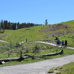 MAMMOTH HOT SPRINGS…. The next day we headed to the northern part of the park with a couple of main stops we wanted to see. My brother flew in to camp with us as well. My boys rode with him in his rental car….which was a sports car…they thought they were cool. We hit some road construction on the way up but lucked out on our timing. There were less points of interest on this road to get to the hot springs which was kinda nice. We then made it to the Mammoth Hot Springs…. I was there when I was a kid as well. The biggest area that was active…a “few” years ago…wasnt active anymore but was still a cool place to visit with boardwalks. There were some smaller sites that the GyPSy tour guide recommended you could drive through which were just as nice I thought.